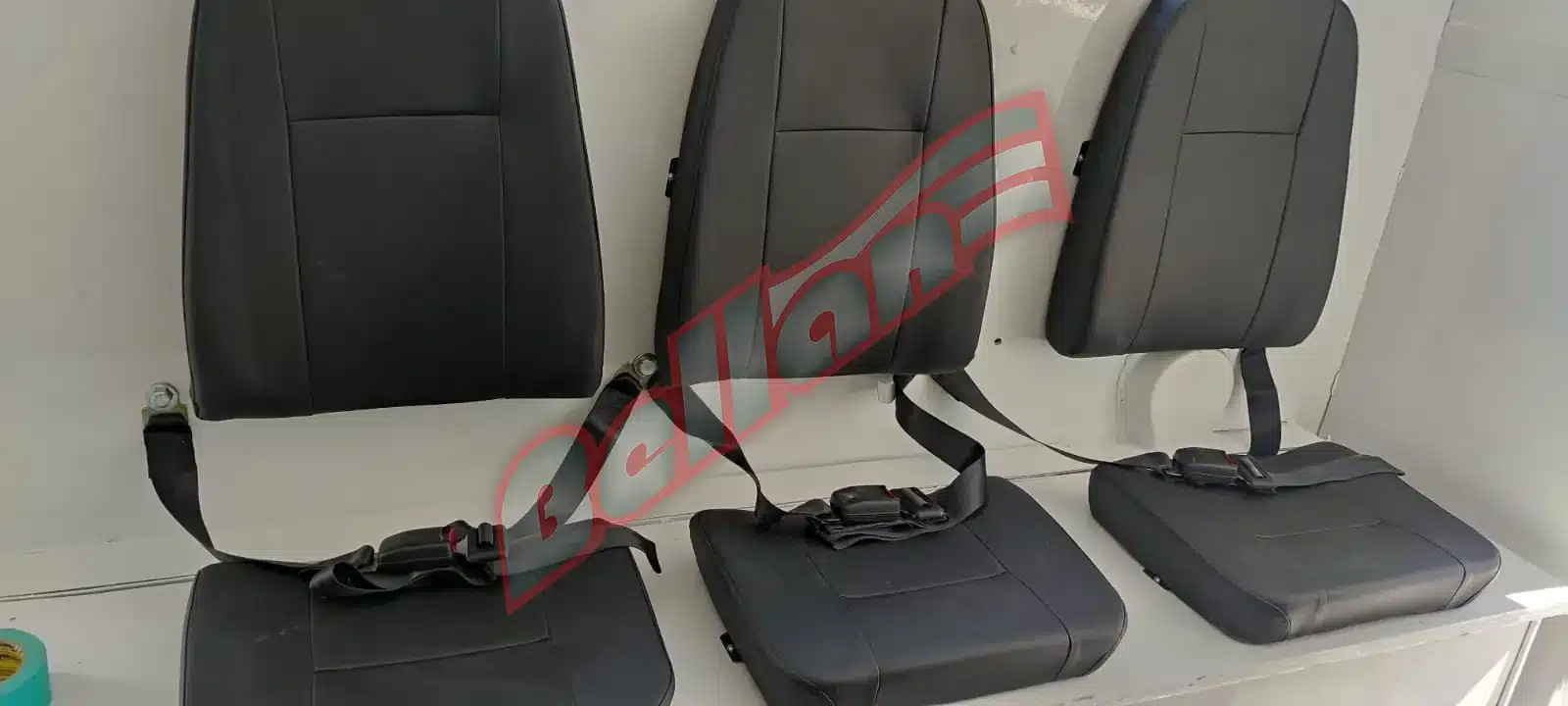 Banco baú, para 03 acompanhantes na lateral, com assentos e encostos inteiriço, revestidos em courvin automotivo, com cintos de segurança individuais, construído em compensado naval, revestidos em fórmica texturizada e com estofamento em courvin de alta resistência;